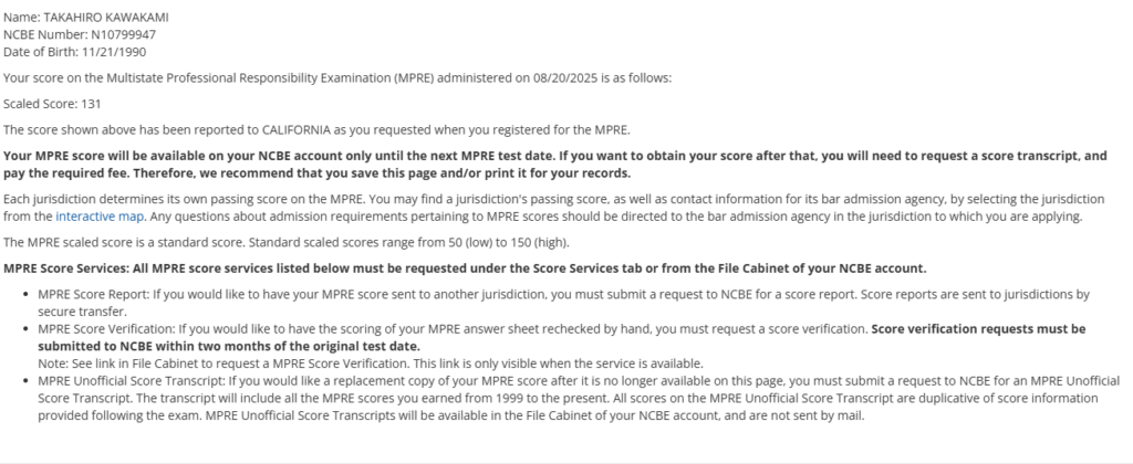 MPRE試験結果出ましたね。おめでとうございます。